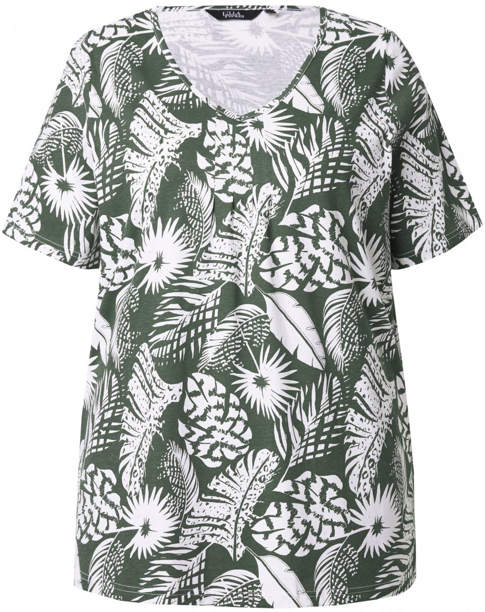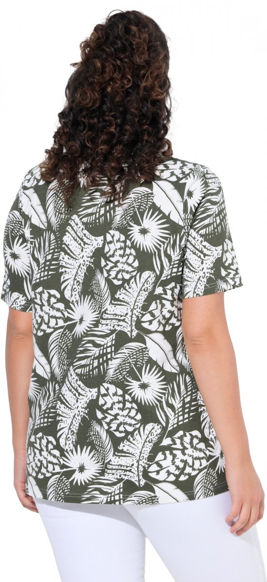 Dydžių vadovas - Ulla Popken Feather Print Short Sleeve V-Neck Tee Olive Grey
