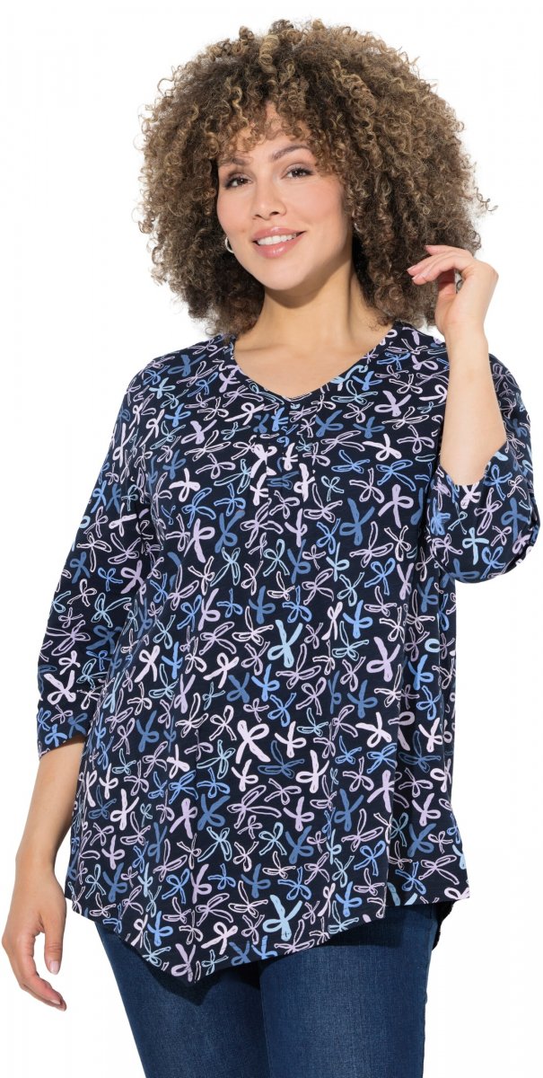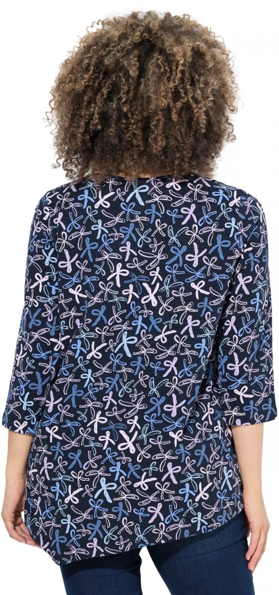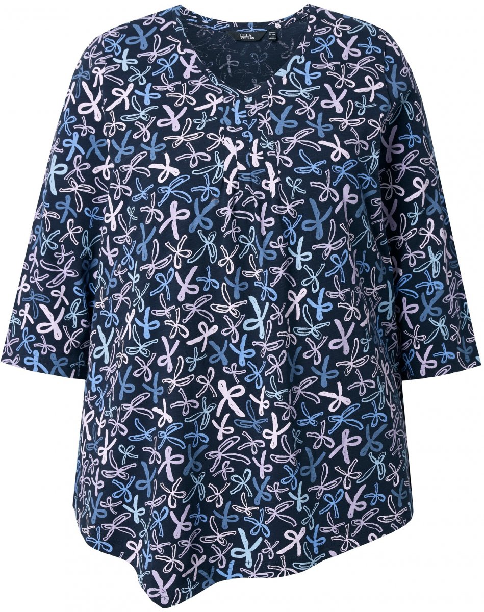Dydžių vadovas - Ulla Popken Ribbon Print 3/4 Sleeve Asymmetric Tee Navy