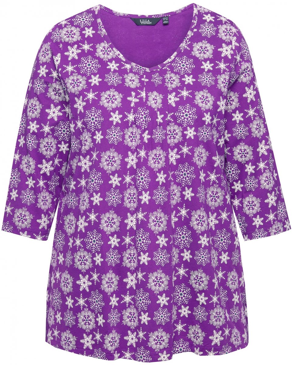Dydžių vadovas - Ulla Popken Snowflake Print 3/4 Sleeve A-Line Tee Dark Purple