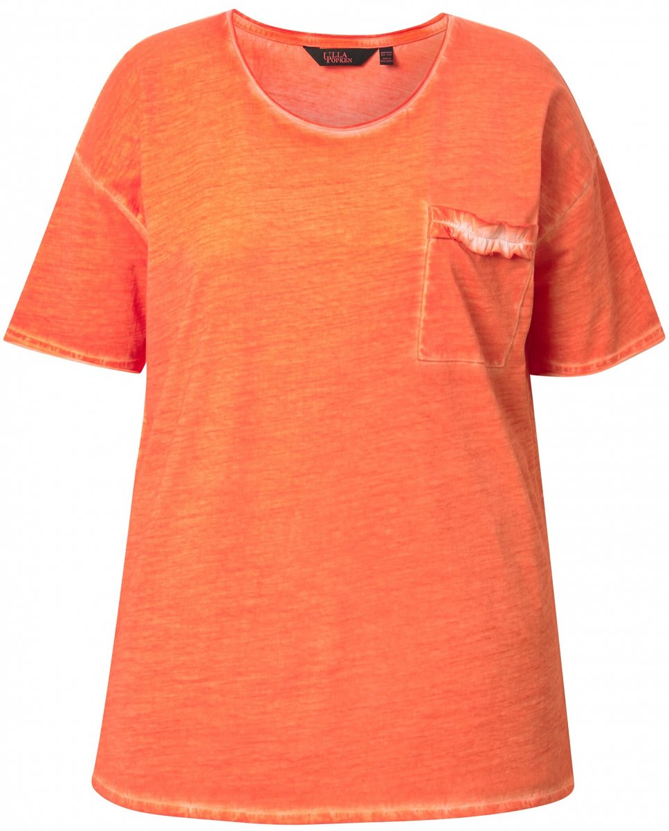Dydžių vadovas - Ulla Popken Cold Dye Ruffle Edge Pocket Tee Coral Pink
