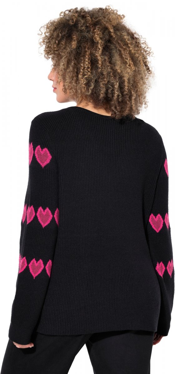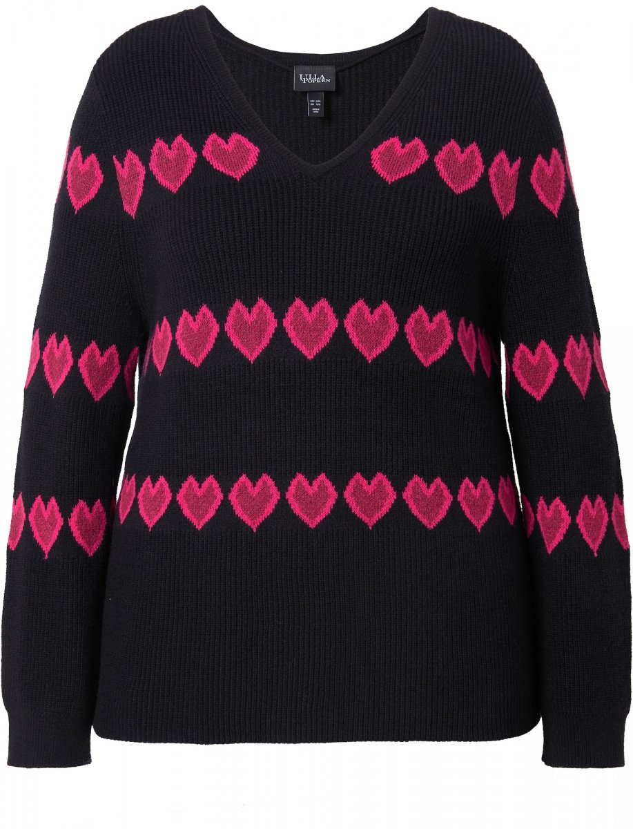 Ulla Popken Heart Print Long Sleeve V-Neck Sweater Black