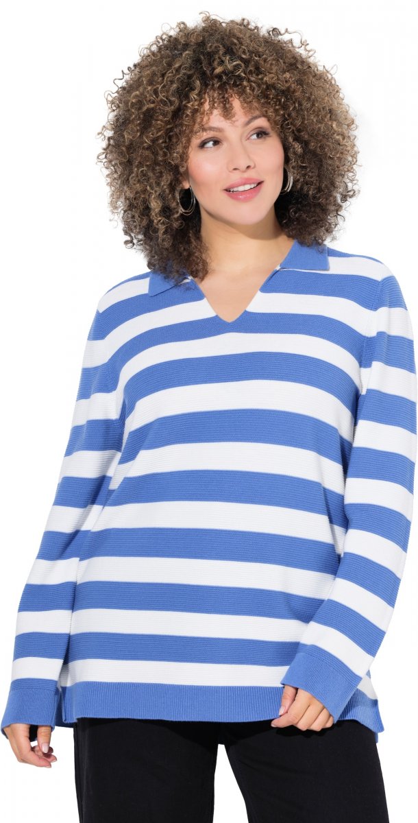 Dydžių vadovas - Ulla Popken Striped Polo Collar Long Sleeve Sweater Aegean Blue